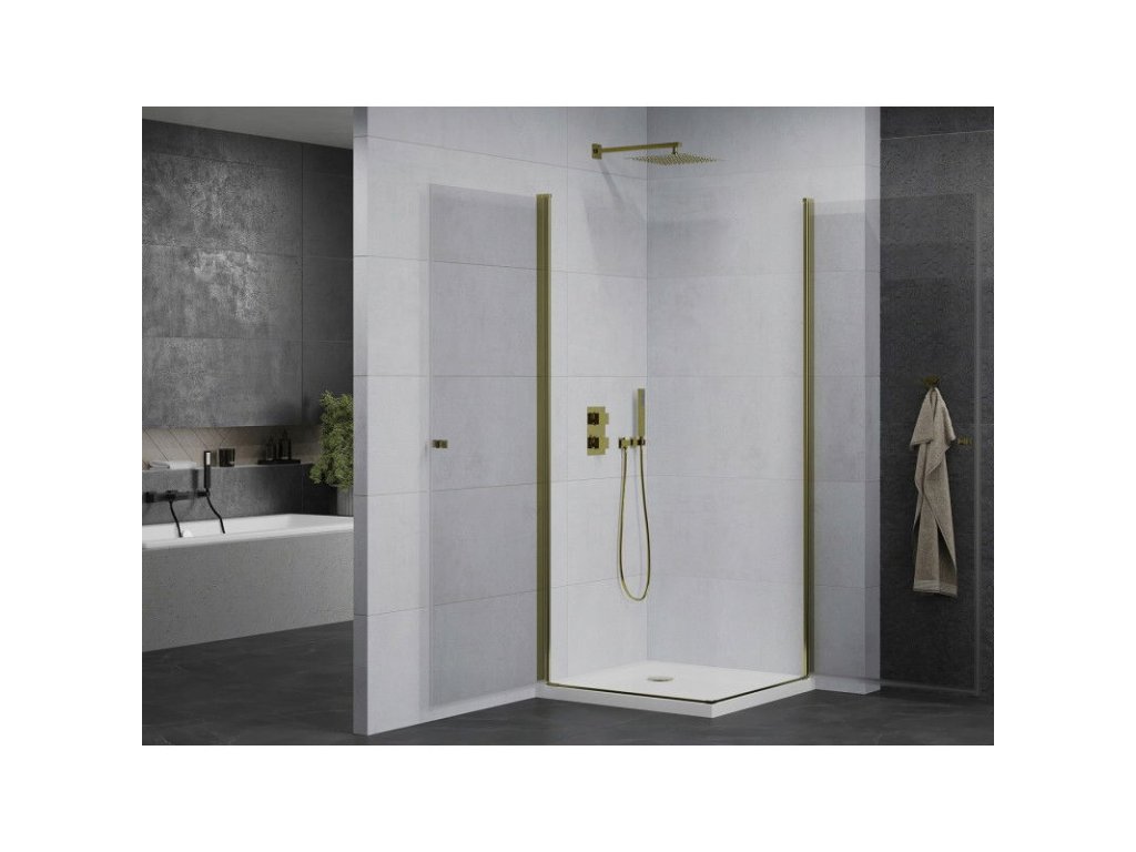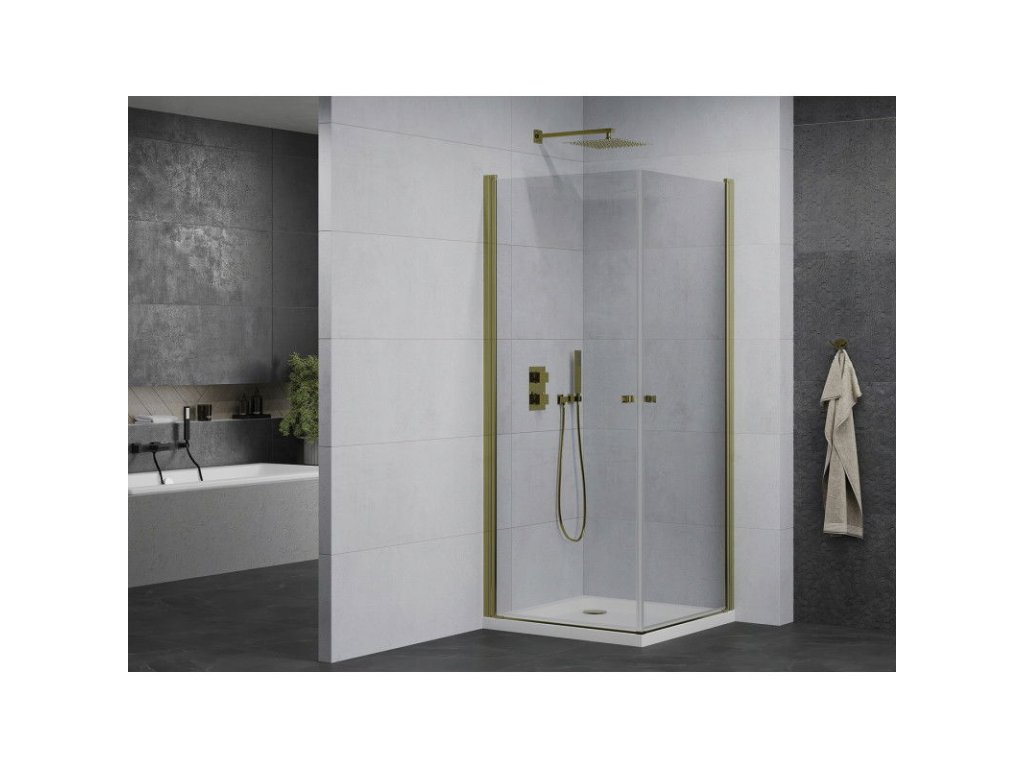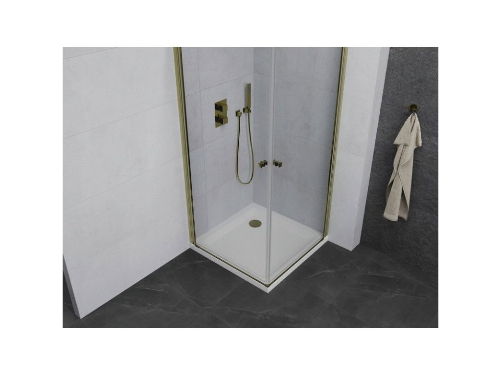 Mexen Pretoria Duo sprchový kút otvárací 70 x 70 cm, priehľadné sklo, profil zlatý + sprchová vanička Flat - 852-070-070-50-02-4010G