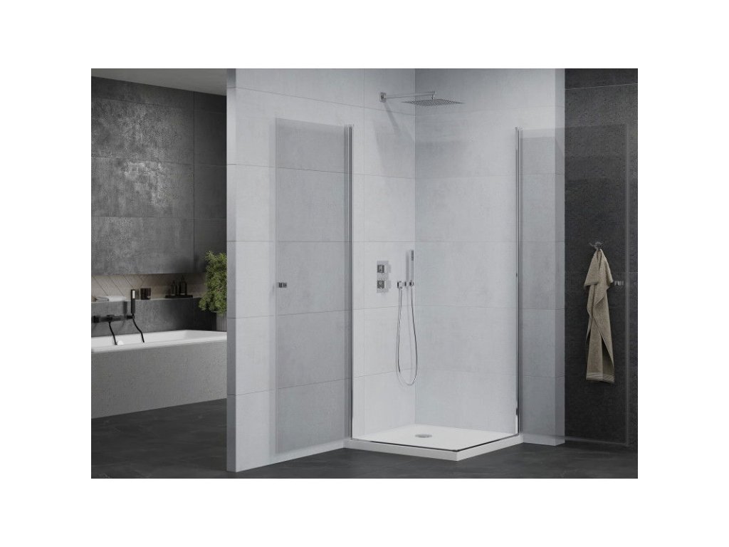 Mexen Pretoria Duo sprchový kút otvárací 90 x 90 cm, priehľadné sklo, profil chróm + sprchová vanička Flat - 852-090-090-01-02-4010