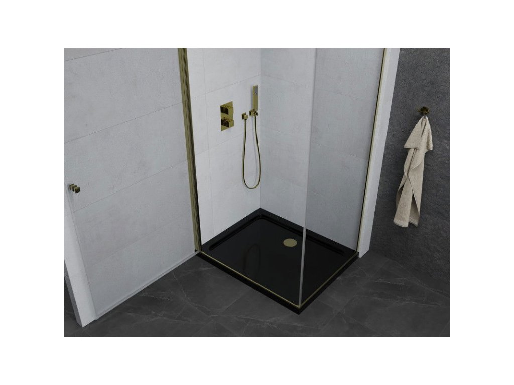 Mexen Pretoria sklápací sprchový kút 70 x 100 cm, transparentný, zlatý + Plochá sprchová vanička, čierna - 852-070-100-50-00-4070G