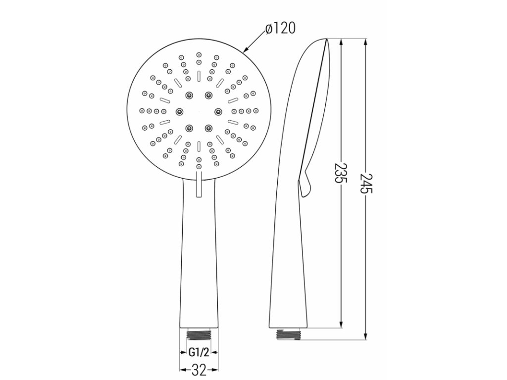 Špecifikácie výrobku: Materiál: plast Povrchová úprava: Chróm/šedá Počet funkcií: 3 Tvar: kruhový Pripojenie: G 1/2" Výška: 235 mm Veľkosť hlavy: ø120 mmDodatočné parametre