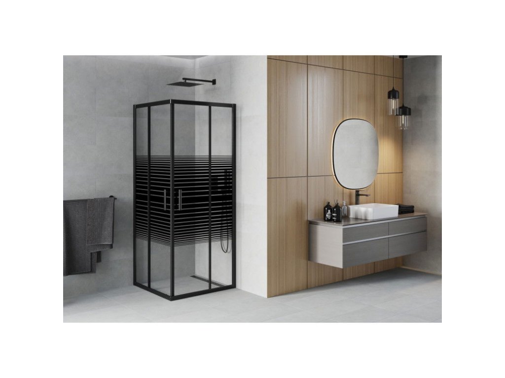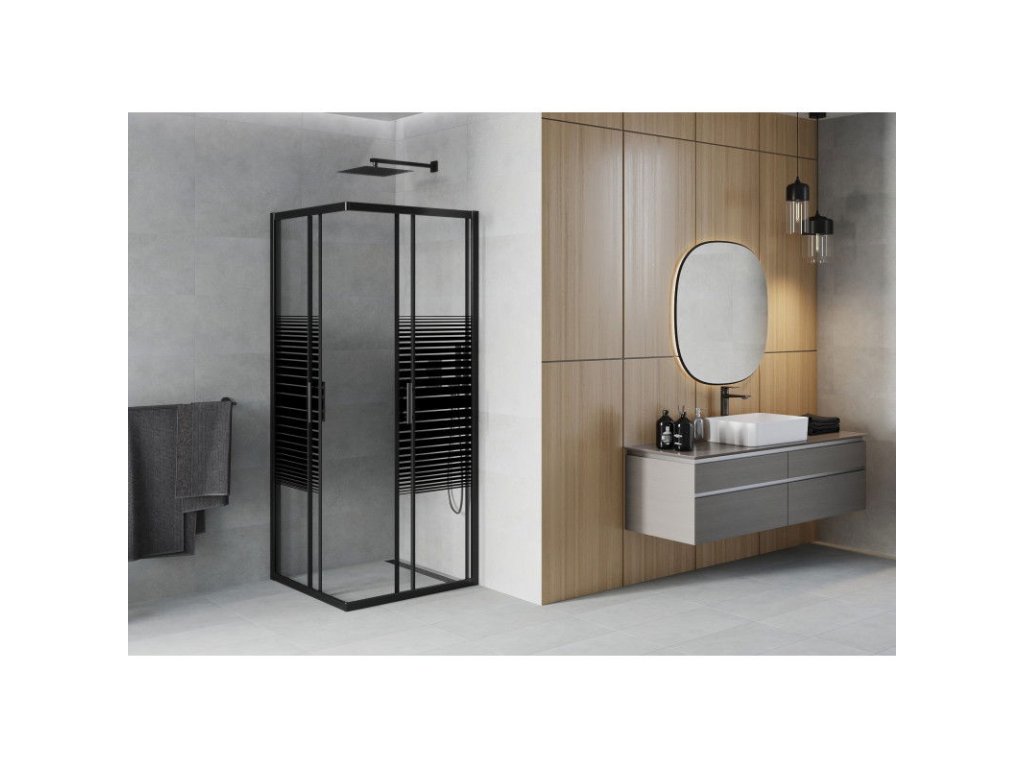 Technické údaje: rozmery: 70x70 cm výška: 190 cm montáž: univerzálna Ľ+P vstup: posuvné dvere farba skla: priehľadný - transparent - pásy povrchová úprava: čierna matná typ skla: tvrdené - bezpečnostné hrúbka skla: 5 mm profil: hliník povlak pre ľahké čistenie : áno vyrovnanie nerovností steny: áno nastavenie šírky: áno montáž na dlažbu alebo sprchovú vaničku: áno kovová rukoväť sada tesnení na odvod vody hliníkový prah dveríDodatočné parametre