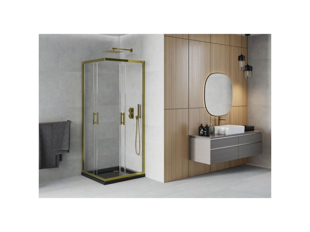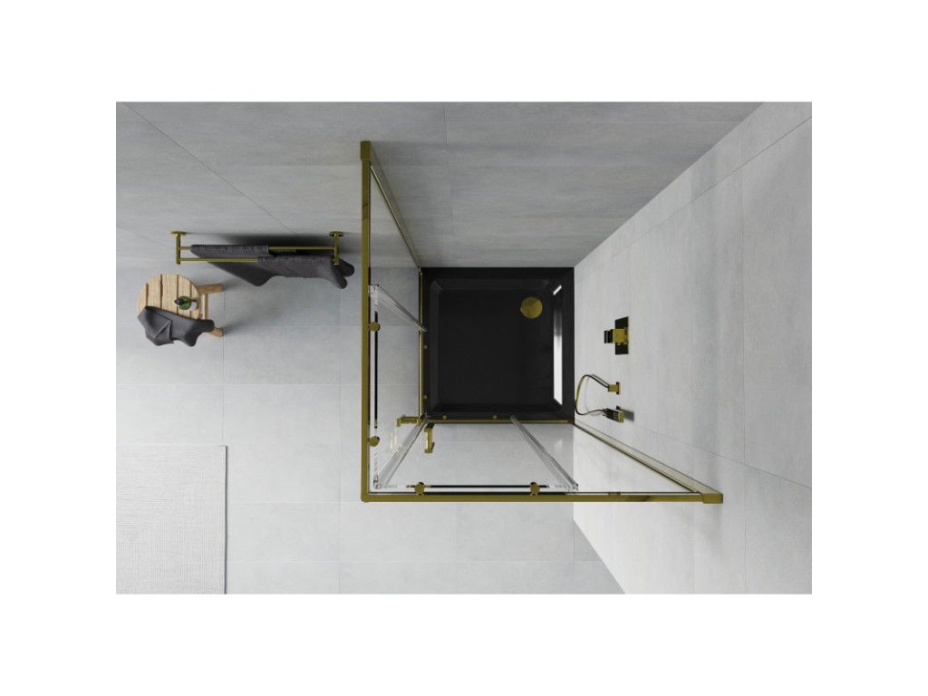 Mexen Rio sprchový kút štvorcový 70 x 70 cm, priehľadné sklo, profil zlatý + sprchová vanička Flat, čierna- 860-070-070-50-00-4070G