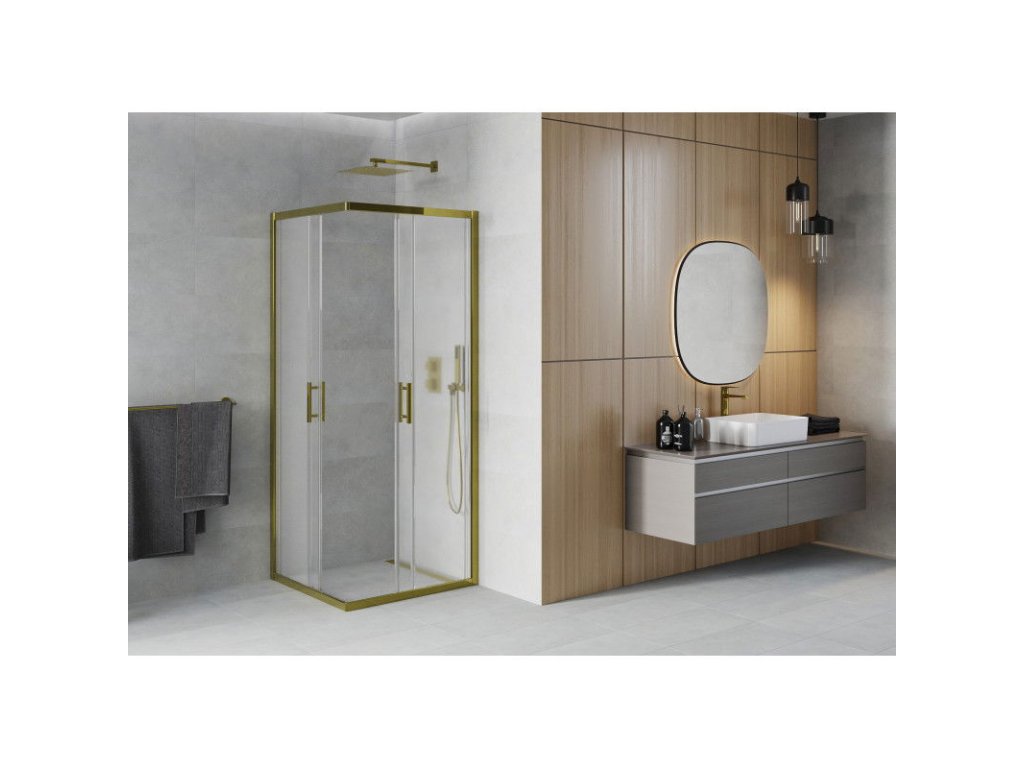Technické údaje: rozmery: 80x80 cm výška: 190 cm montáž: univerzálna Ľ+P vstup: posuvné dvere farba skla: námraza povrchová úprava: zlatá lesklá typ skla: tvrdené - bezpečnostné hrúbka skla: 5 mm profil: hliník povlak pre ľahké čistenie : áno vyrovnanie nerovností steny: áno nastavenie šírky: áno montáž na dlažbu alebo sprchovú vaničku: áno kovová rukoväť sada tesnení na odvod vody hliníkový prah dveríDodatočné parametre