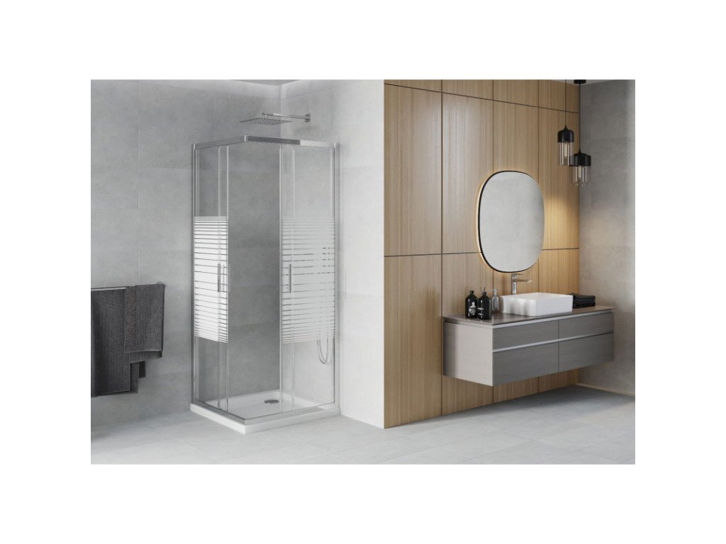 Mexen Rio sprchový kút štvorcový 80 x 80 cm, pásy, profil chróm + sprchová vanička Flat, biela - 860-080-080-01-20-4010