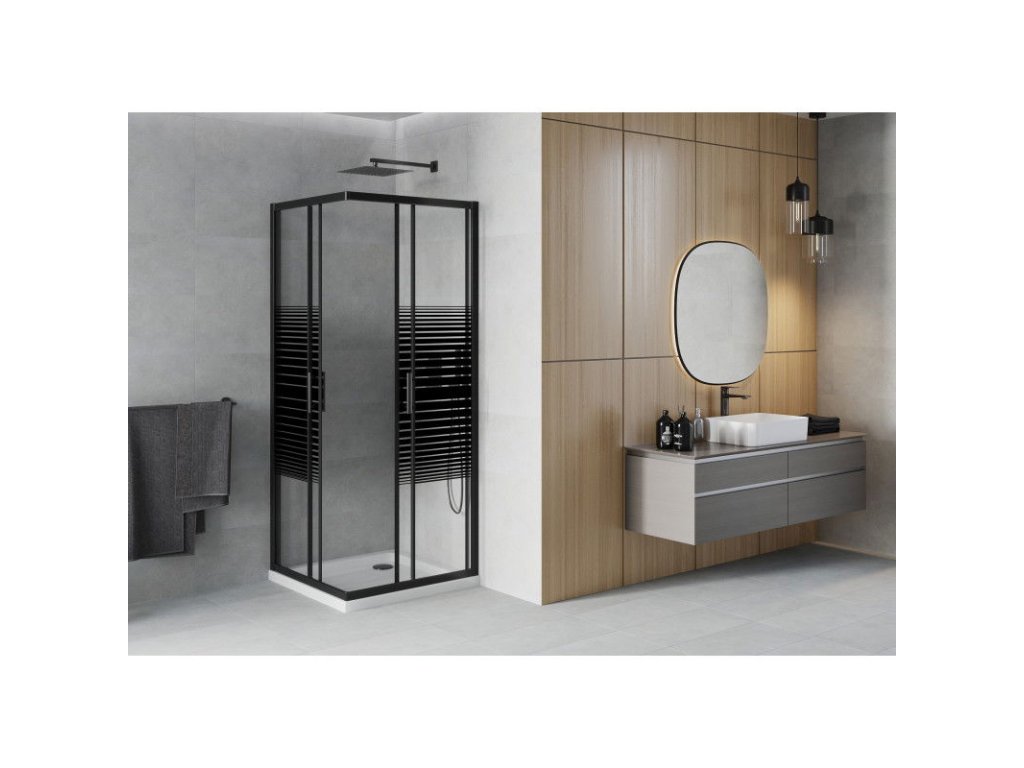 Mexen Rio sprchový kút štvorcový 80 x 80 cm, pásy, profil čierny + sprchová vanička Flat, biela - 860-080-080-70-20-4010B