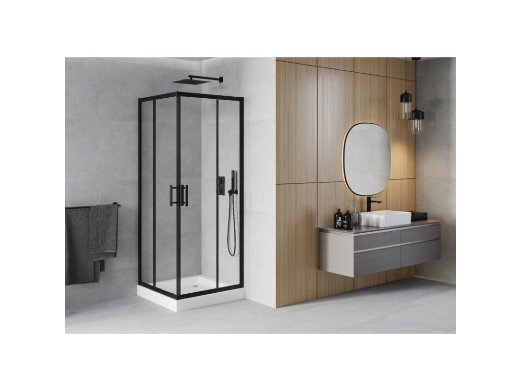 Mexen Rio sprchový kút štvorcový 80 x 80 cm, priehľadné sklo, profil čierny + sprchová vanička Rio, biela - 860-080-080-70-00-4510