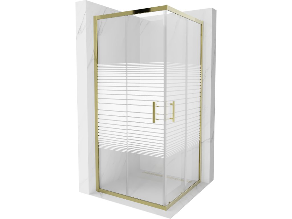Technické údaje: rozmery: 90x90 cm výška: 190 cm montáž: univerzálna Ľ+P vstup: posuvné dvere farba skla: priehľadný - transparent - pásy povrchová úprava: zlatá lesklá typ skla: tvrdené - bezpečnostné hrúbka skla: 5 mm profil: hliník povlak pre ľahké čistenie : áno vyrovnanie nerovností steny: áno nastavenie šírky: áno montáž na dlažbu alebo sprchovú vaničku: áno kovová rukoväť sada tesnení na odvod vody hliníkový prah dveríDodatočné parametre