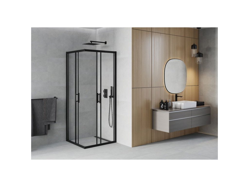 Technické údaje: rozmery: 90x90 cm výška: 190 cm montáž: univerzálna Ľ+P vstup: posuvné dvere farba skla: priehľadné - transparent povrchová úprava: čierna matná typ skla: tvrdené - bezpečnostné hrúbka skla: 5 mm profil: hliník povlak pre ľahké čistenie : áno vyrovnanie nerovností steny: áno nastavenie šírky: áno montáž na dlažbu alebo sprchovú vaničku: áno kovová rukoväť sada tesnení na odvod vody hliníkový prah dveríDodatočné parametre