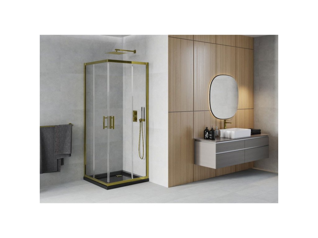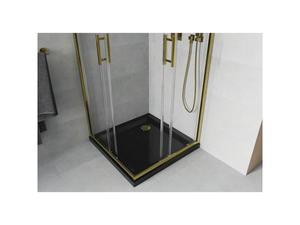 Mexen Rio sprchový kút štvorcový 90 x 90 cm, priehľadné sklo, profil zlatý + sprchová vanička Flat, čierna- 860-090-090-50-00-4070G