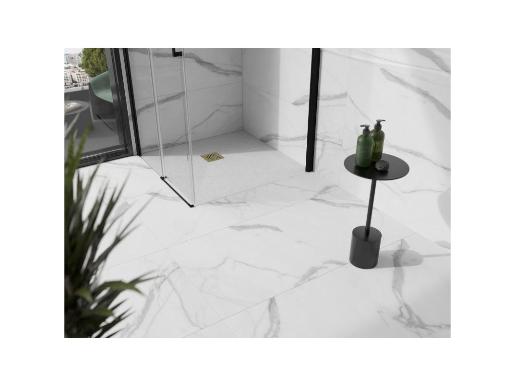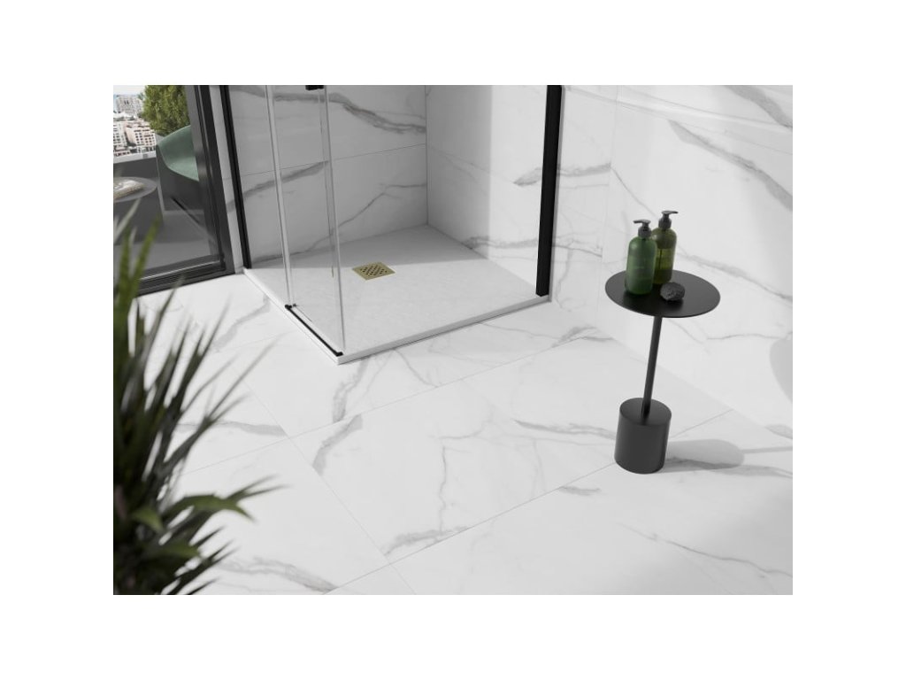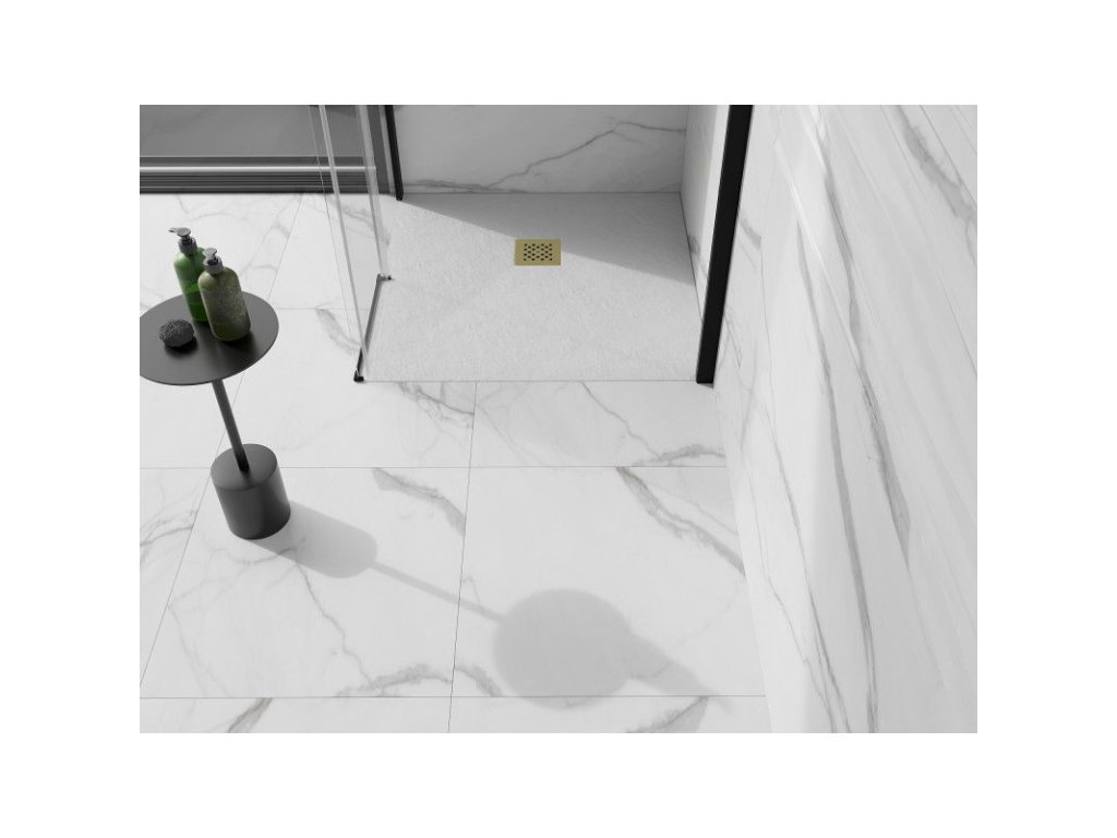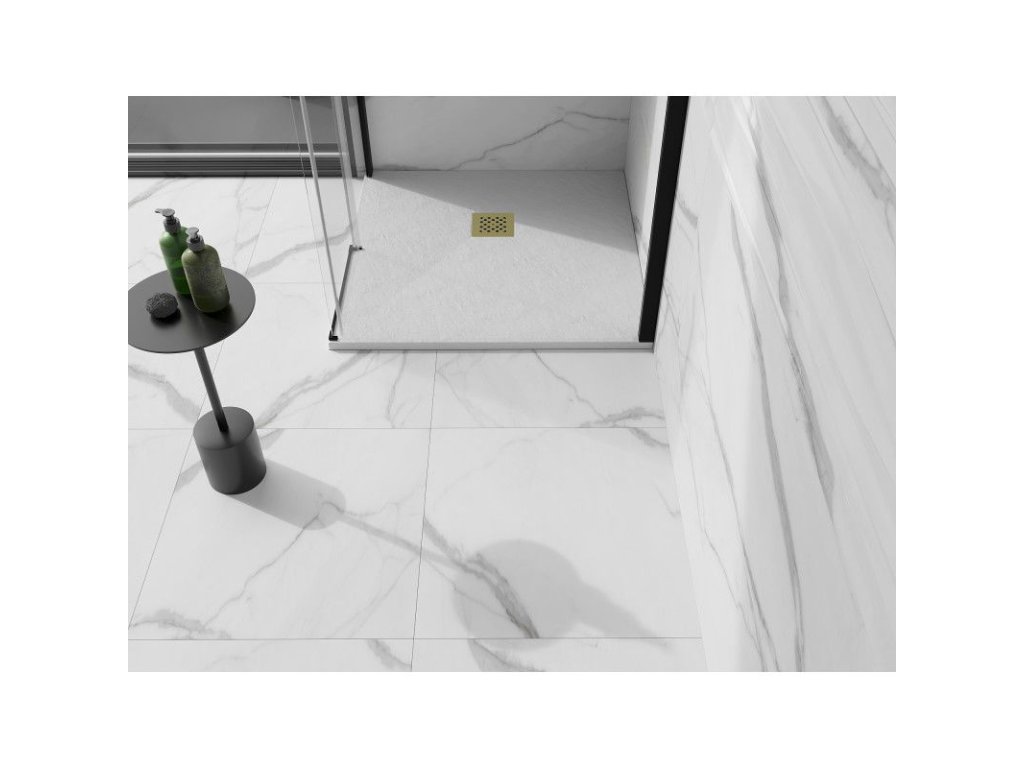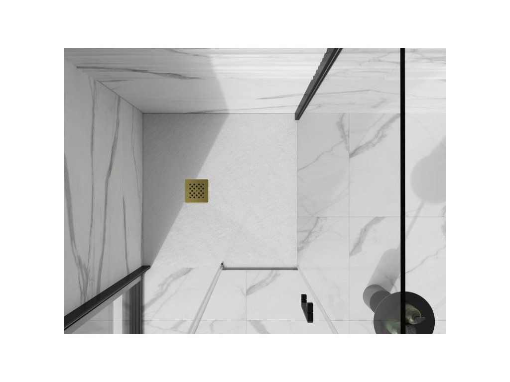 Mexen Stone+ štvorcová kompozitná sprchová vanička 100 x 100 cm, biela, zlatá mriežka - 44101010-G