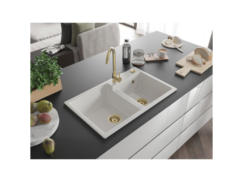Mexen Tomas 2-komorový granitový drez 800 x 500 mm, biely, zlatý sifón - 6516802000-20-G
