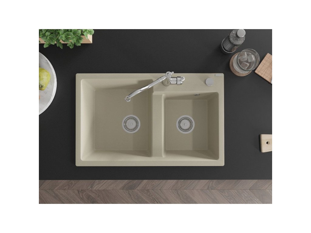 Mexen Tomas 2-komorový granitový drez s kuchynskou batériou Carla, béžová - 6516-69-670700-00