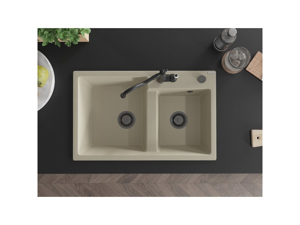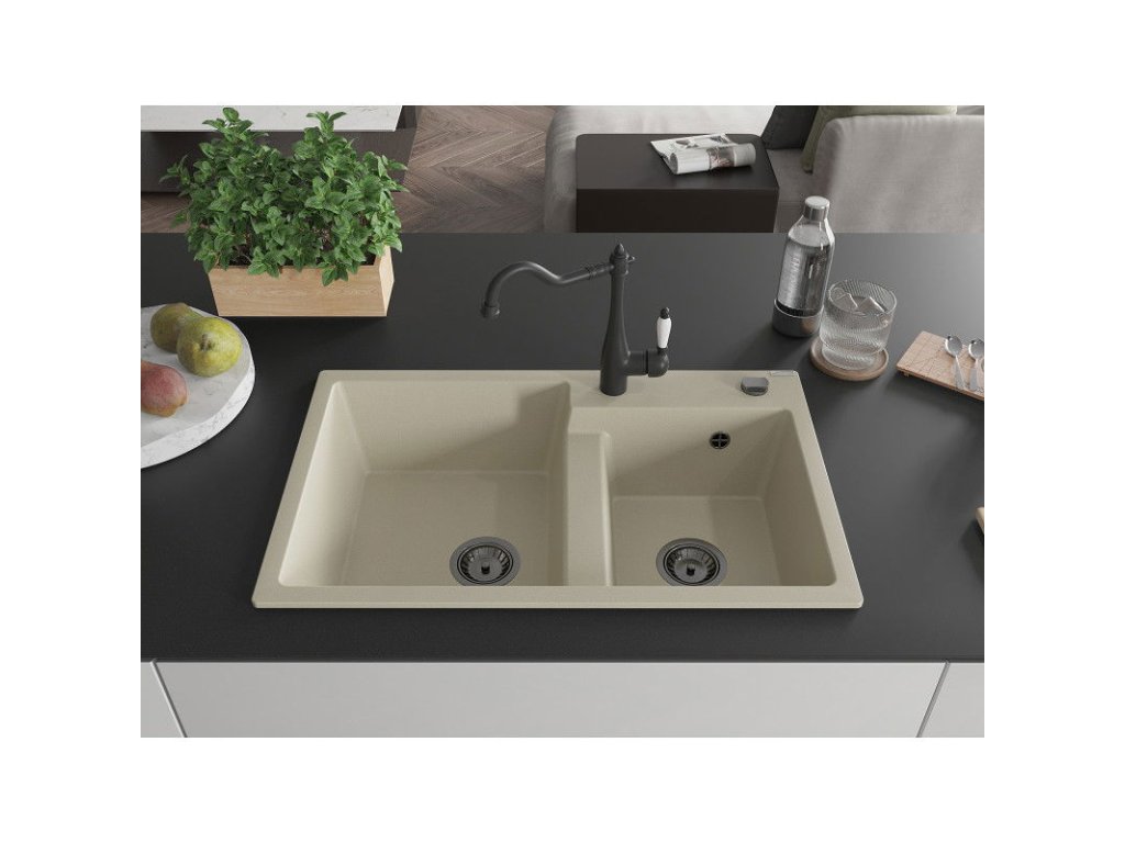 Mexen Tomas 2-komorový granitový drez s kuchynskou batériou Carla, béžová - 6516-69-670700-70