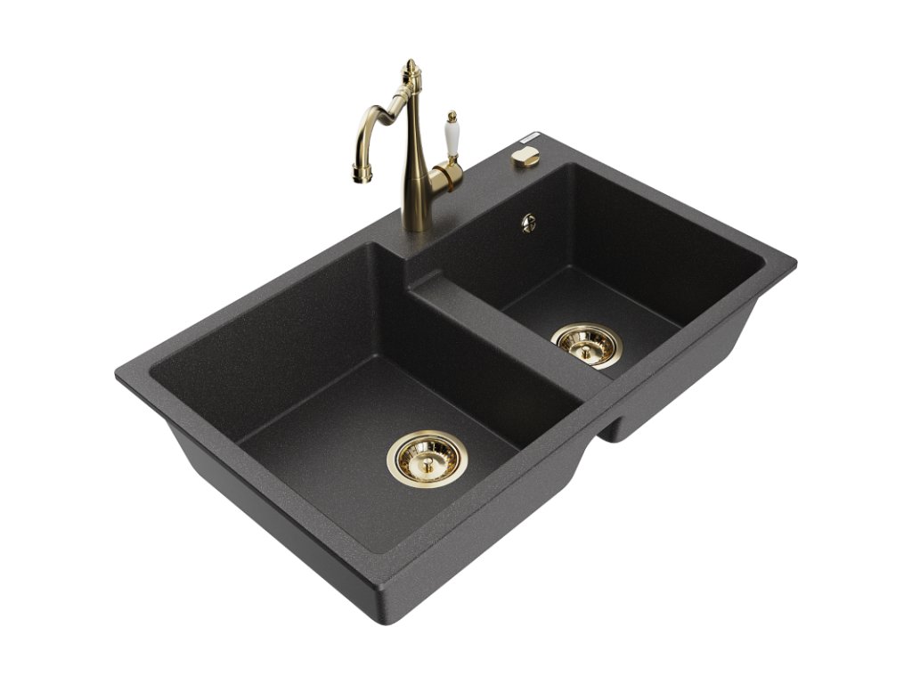 Mexen Tomas 2-komorový granitový drez s kuchynskou batériou Carla, čierna škvrnitá - 6516-76-670700-50