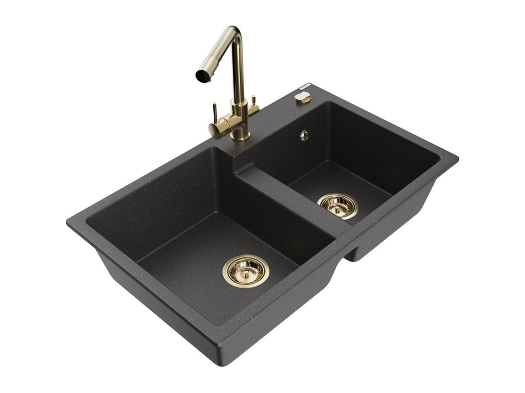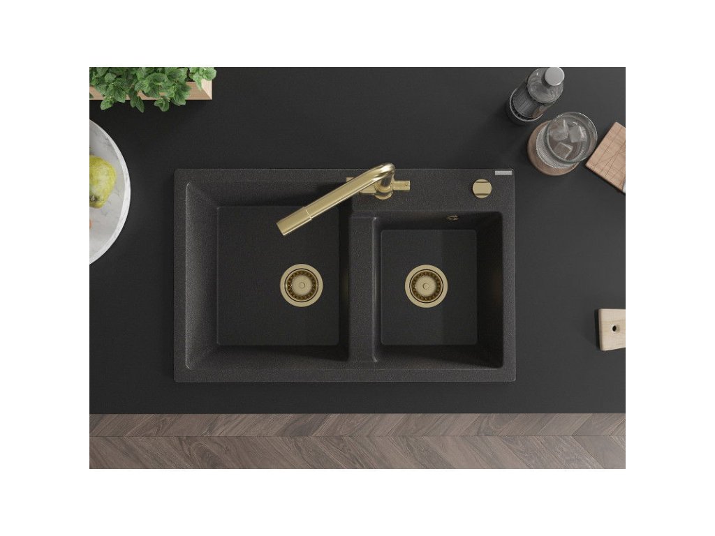 Mexen Tomas 2-komorový granitový drez s kuchynskou batériou Duero, čierna škvrnitá - 6516-76-671600-50