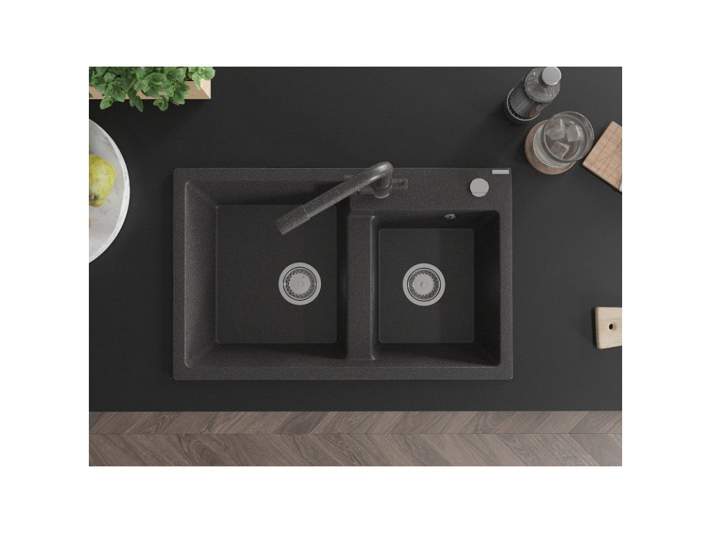 Mexen Tomas 2-komorový granitový drez s kuchynskou batériou Duero, čierna škvrnitá - 6516-76-671600-76