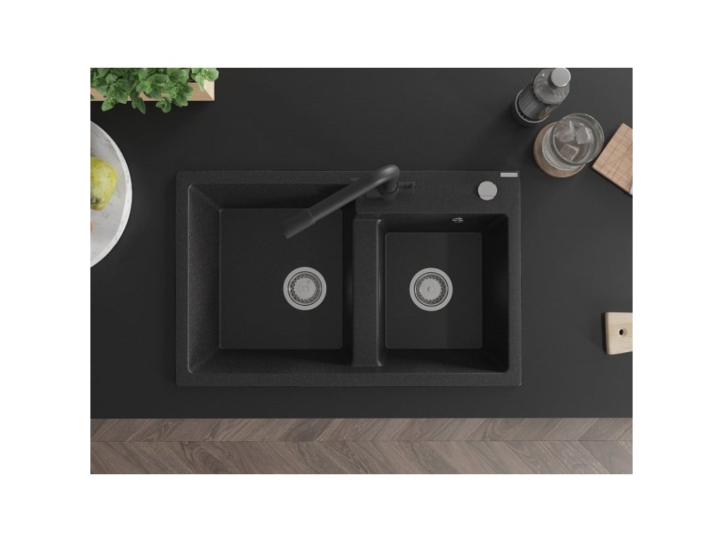 Mexen Tomas 2-komorový granitový drez s kuchynskou batériou Duero, čierna/strieborná metalíza - 6516-73-671600-70