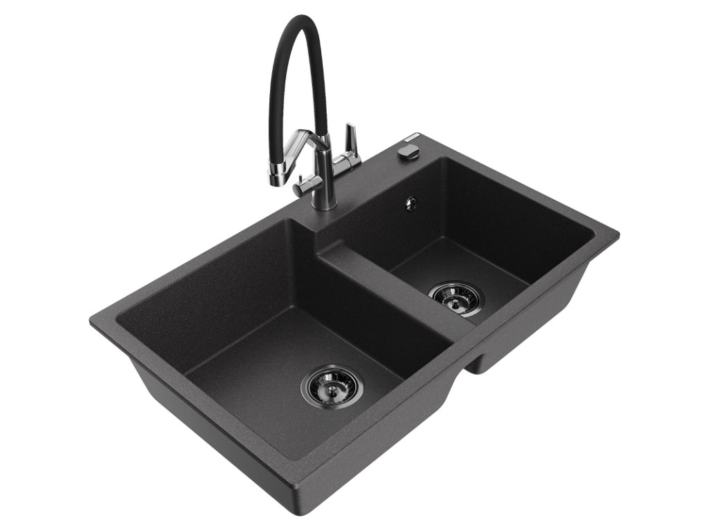 Mexen Tomas 2-komorový granitový drez s kuchynskou batériou Duo, čierna škvrnitá - 6516-76-671701-07-B