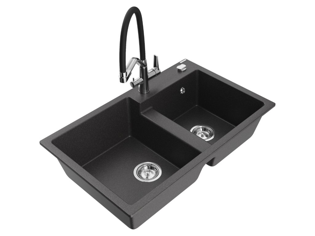 Mexen Tomas 2-komorový granitový drez s kuchynskou batériou Duo, čierna škvrnitá - 6516-76-671701-07