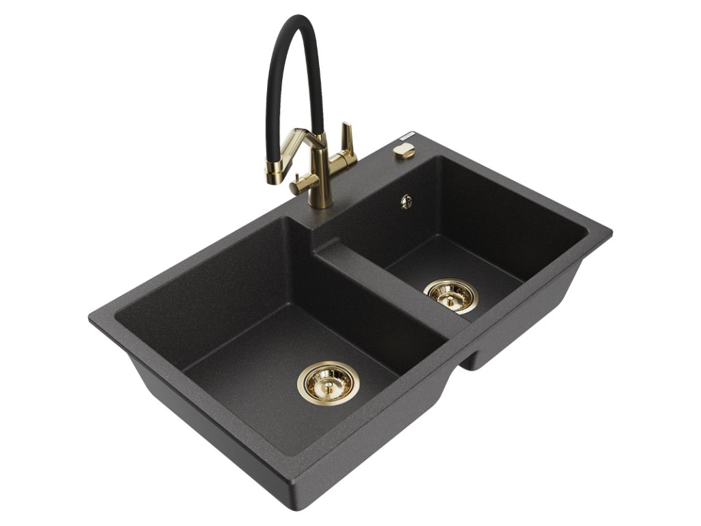 Mexen Tomas 2-komorový granitový drez s kuchynskou batériou Duo, čierna škvrnitá - 6516-76-671701-57-G