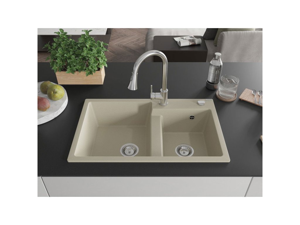 Mexen Tomas 2-komorový granitový drez s kuchynskou batériou Elia, béžová - 6516-69-670101-00