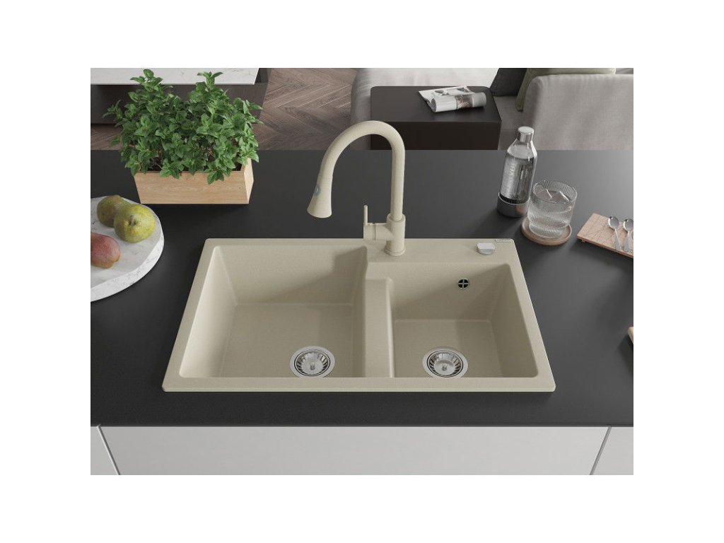 Mexen Tomas 2-komorový granitový drez s kuchynskou batériou Elia, béžová - 6516-69-670101-69