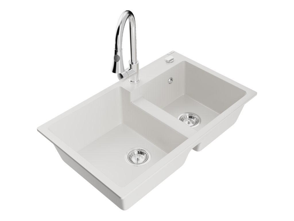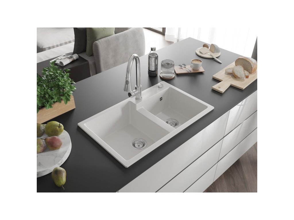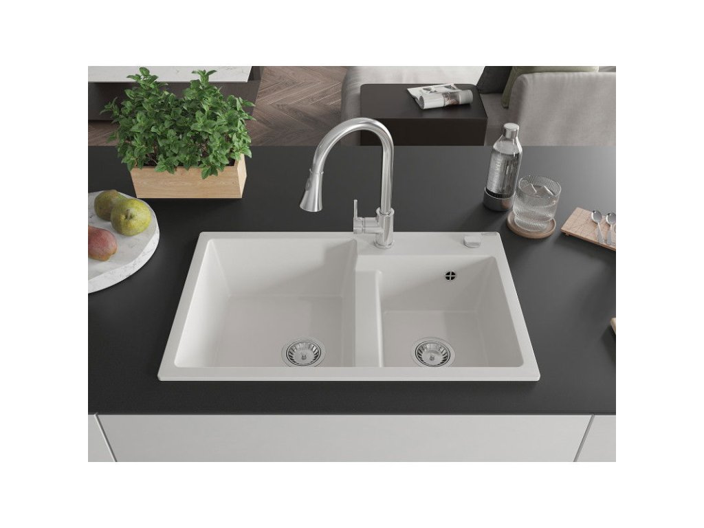 Mexen Tomas 2-komorový granitový drez s kuchynskou batériou Elia, biely - 6516-20-670101-00