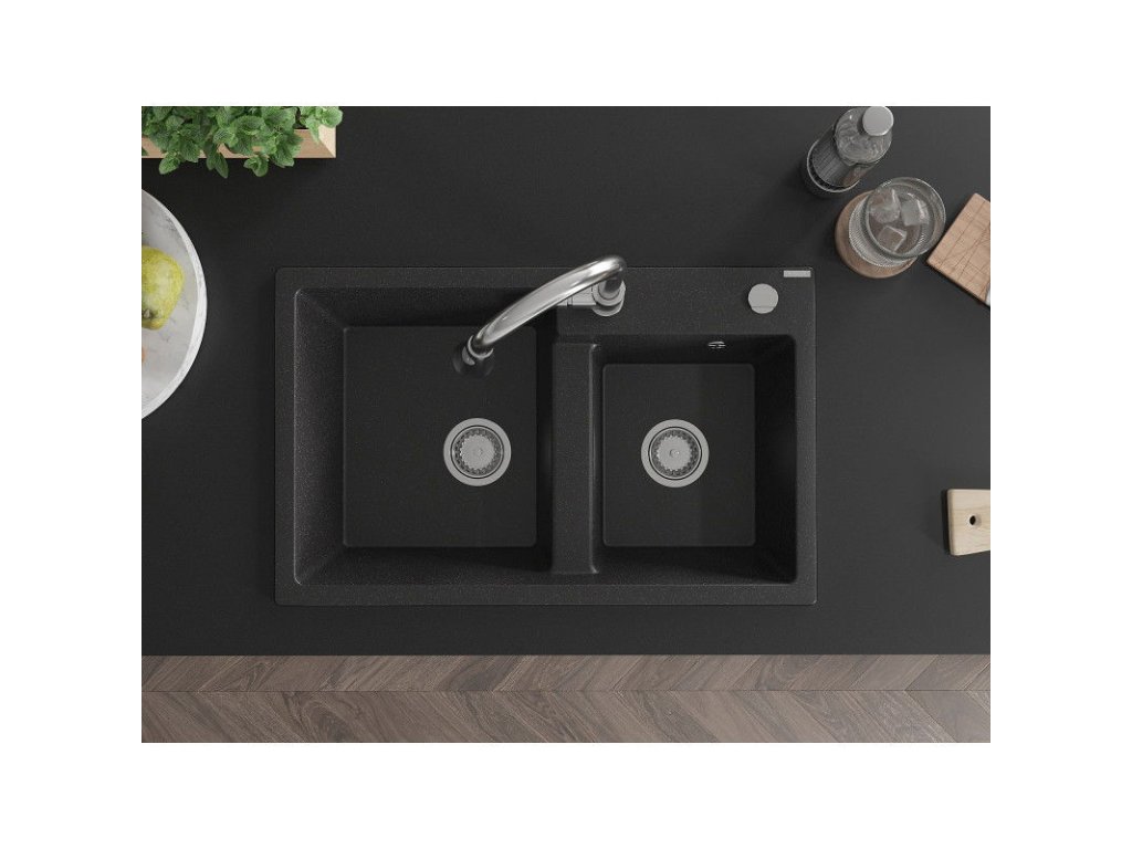 Mexen Tomas 2-komorový granitový drez s kuchynskou batériou Elia, čierna/strieborná metalíza - 6516-73-670101-00