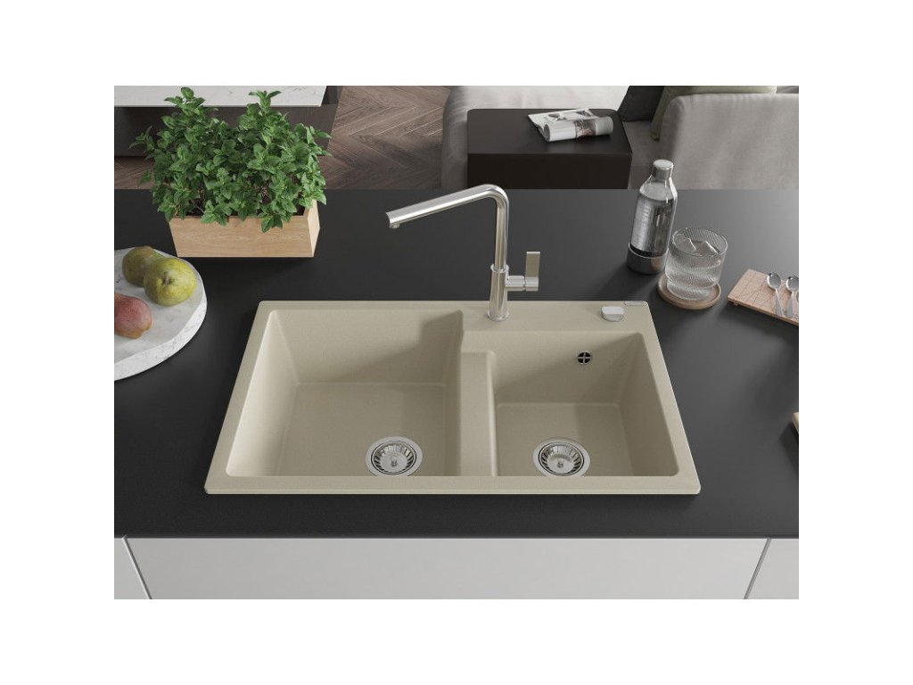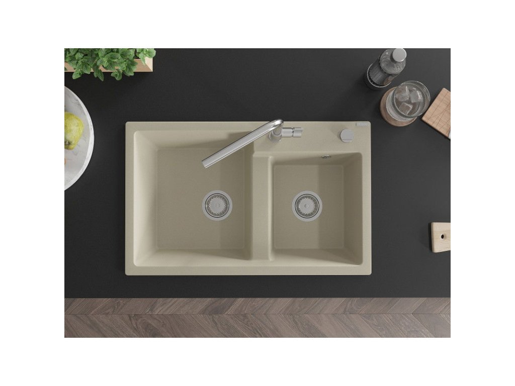 Mexen Tomas 2-komorový granitový drez s kuchynskou batériou Flora, béžová - 6516-69-670401-00