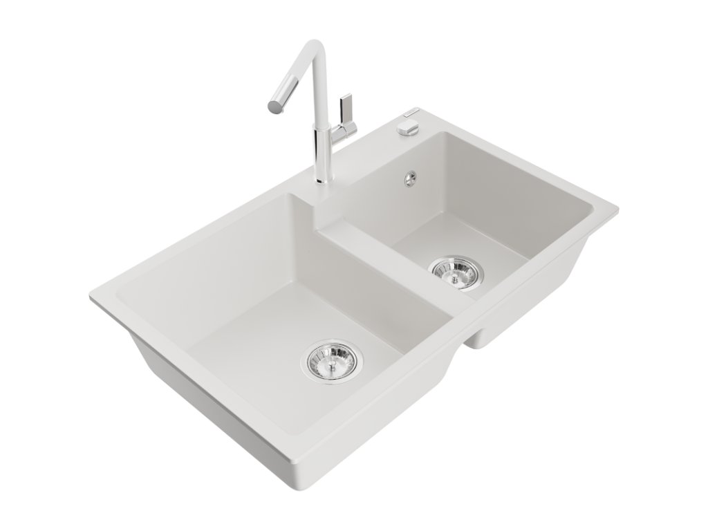Mexen Tomas 2-komorový granitový drez s kuchynskou batériou Flora, biely - 6516-20-670401-02