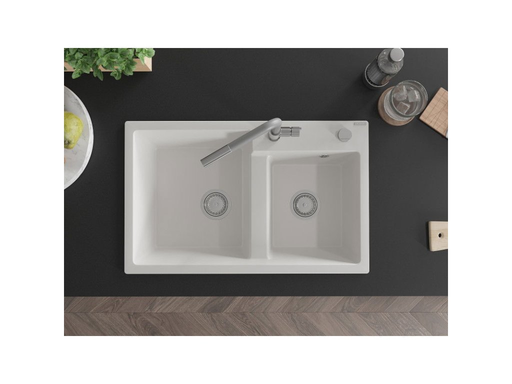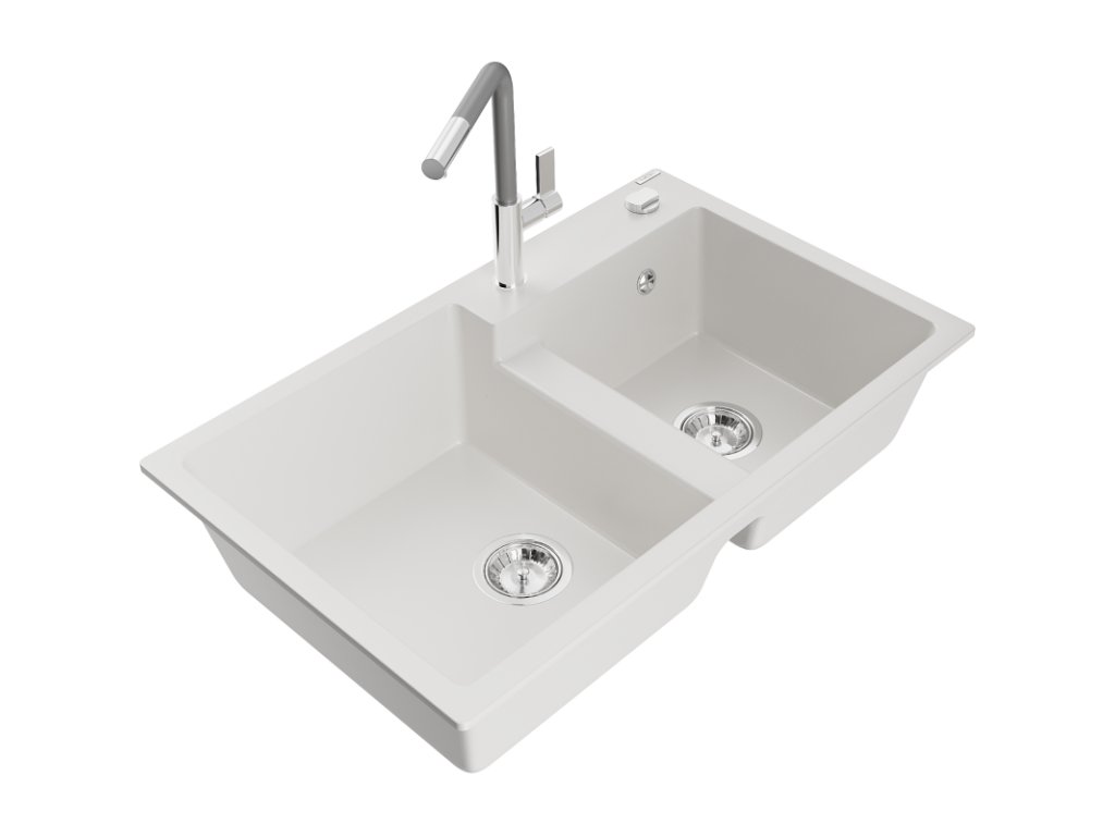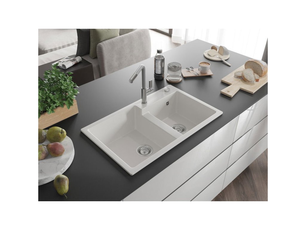 Mexen Tomas 2-komorový granitový drez s kuchynskou batériou Flora, biely - 6516-20-670401-06