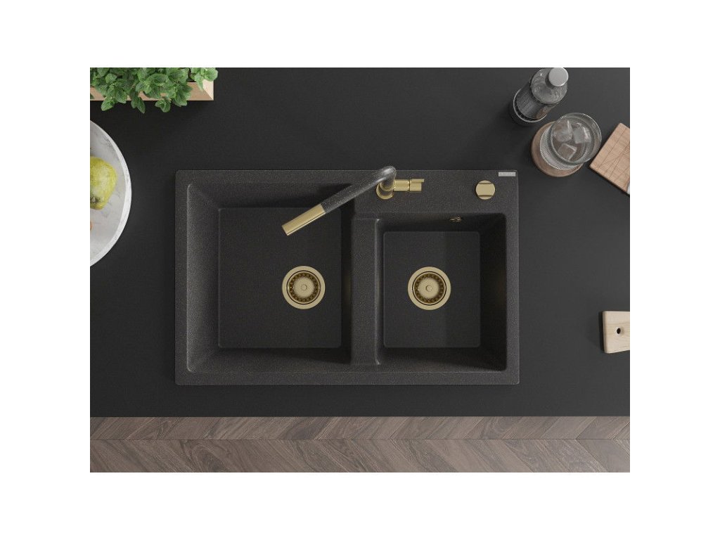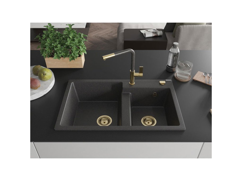Mexen Tomas 2-komorový granitový drez s kuchynskou batériou Flora, čierna škvrnitá - 6516-76-670401-75-G