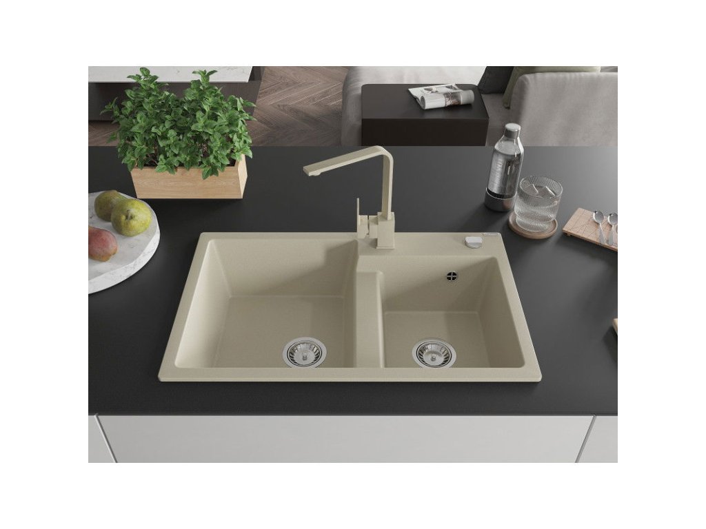 Mexen Tomas 2-komorový granitový drez s kuchynskou batériou Rita, béžový - 6516-69-670300-69
