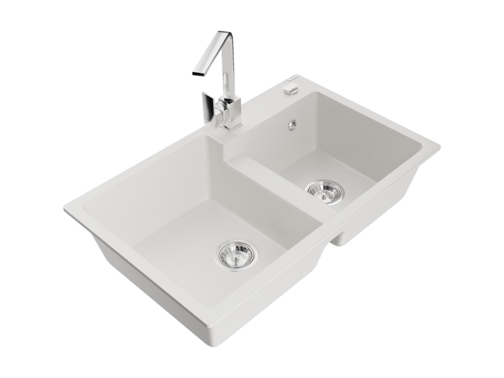Mexen Tomas 2-komorový granitový drez s kuchynskou batériou Rita, biely - 6516-20-670300-00