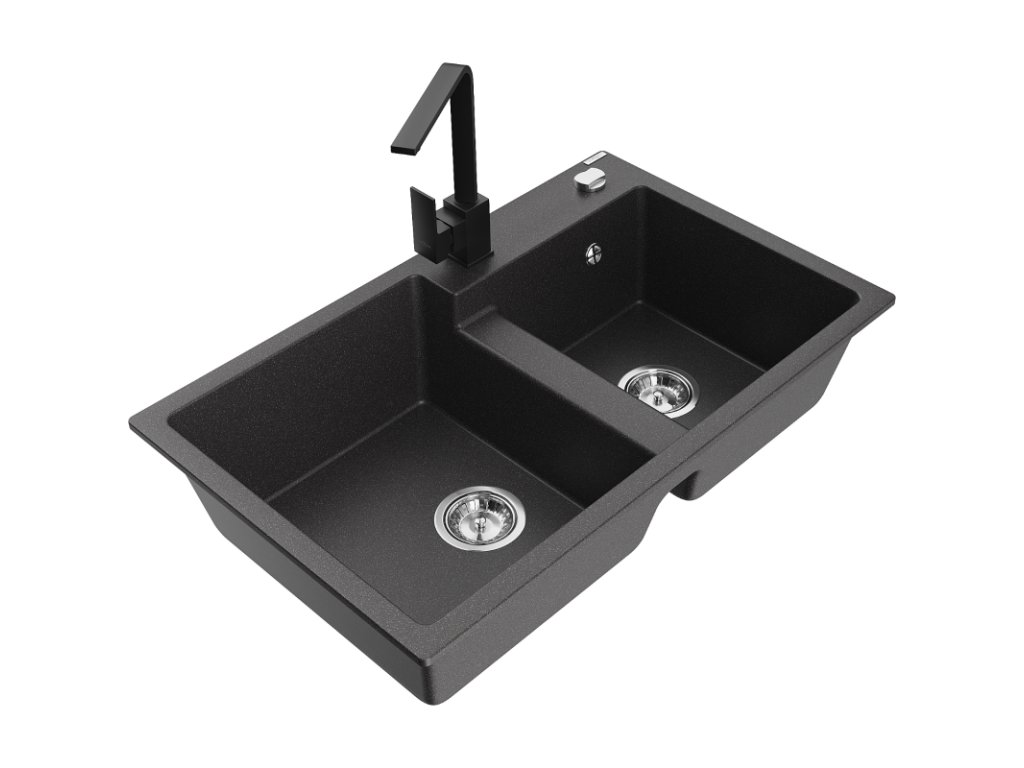 Mexen Tomas 2-komorový granitový drez s kuchynskou batériou Rita, čierna škvrna - 6516-76-670300-70