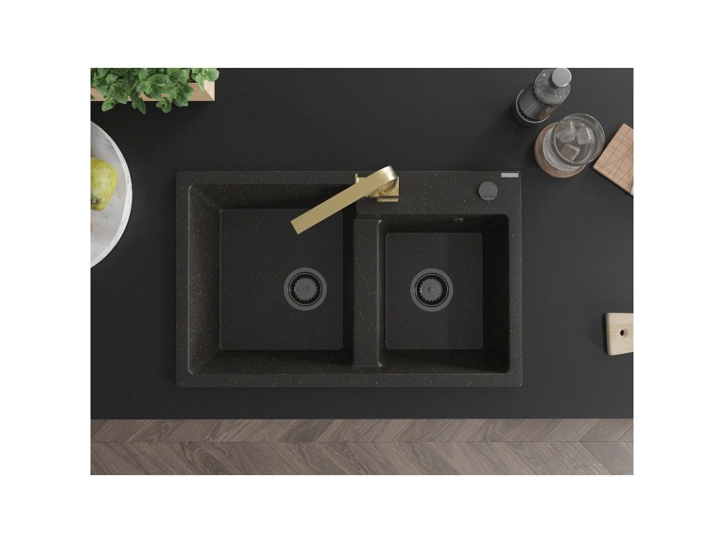 Mexen Tomas 2-komorový granitový drez s kuchynskou batériou Rita, čierna/zlatá metalíza - 6516-75-670300-50-B