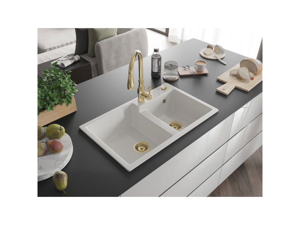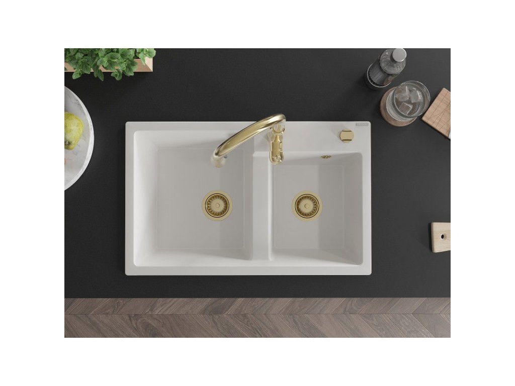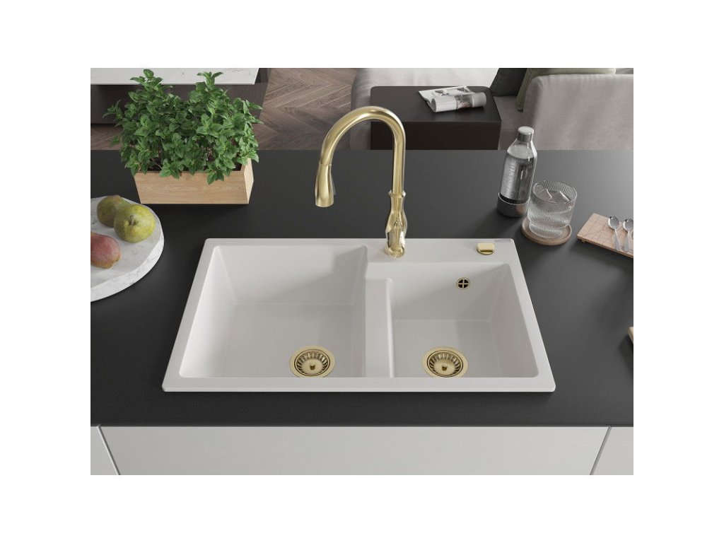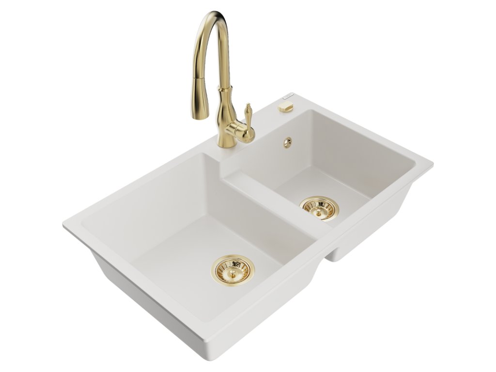 Mexen Tomas 2-komorový granitový drez s kuchynskou batériou Savita, biely - 6516-20-672601-50