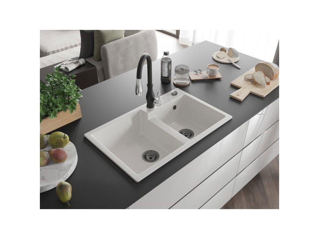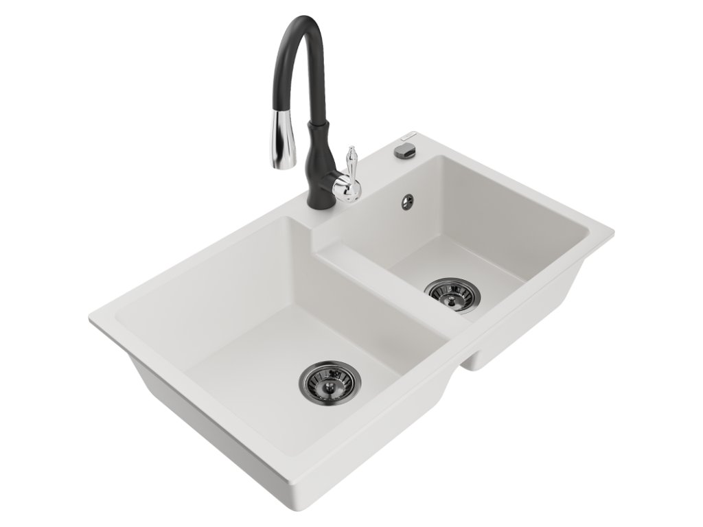 Mexen Tomas 2-komorový granitový drez s kuchynskou batériou Savita, biely - 6516-20-672601-70