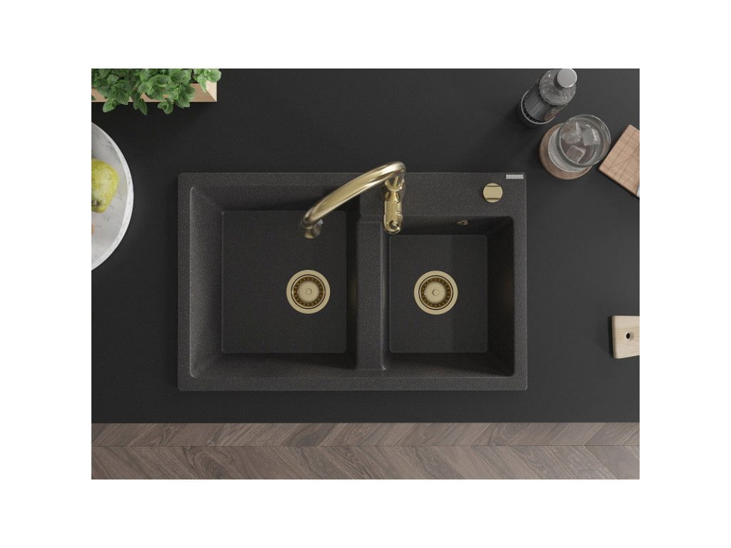 Mexen Tomas 2-komorový granitový drez s kuchynskou batériou Savita, čierna škvrnitá - 6516-76-672601-50