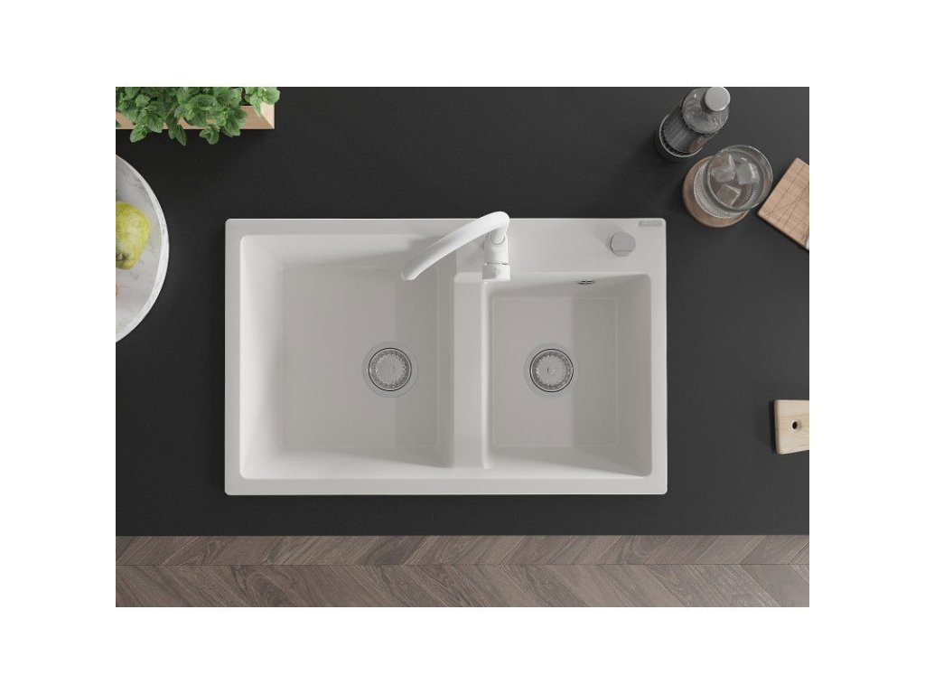 Mexen Tomas 2-komorový granitový drez s kuchynskou batériou Telma, biely - 6516-20-670200-20