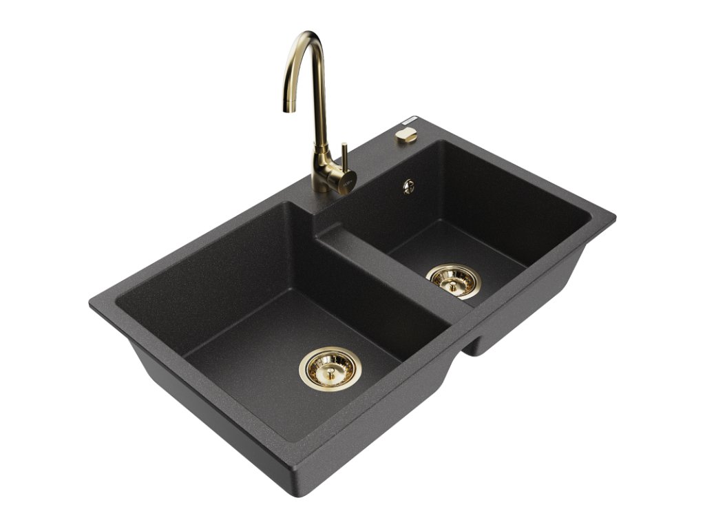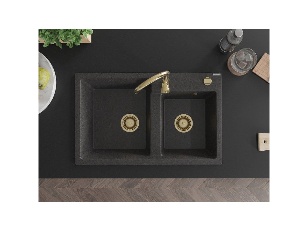 Mexen Tomas 2-komorový granitový drez s kuchynskou batériou Telma, čierna škvrnitá - 6516-76-670200-50