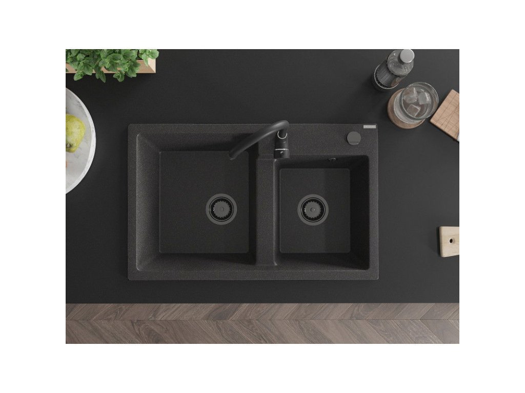 Mexen Tomas 2-komorový granitový drez s kuchynskou batériou Telma, čierna škvrnitá - 6516-76-670200-70-B