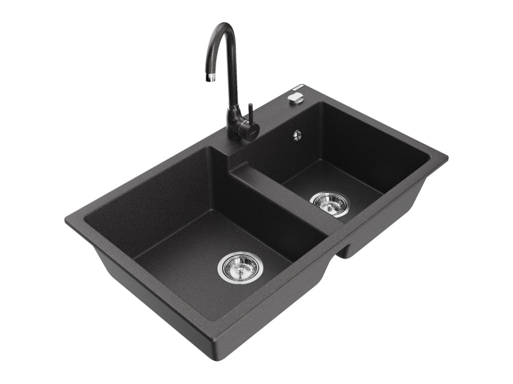 Mexen Tomas 2-komorový granitový drez s kuchynskou batériou Telma, čierna škvrnitá - 6516-76-670200-76
