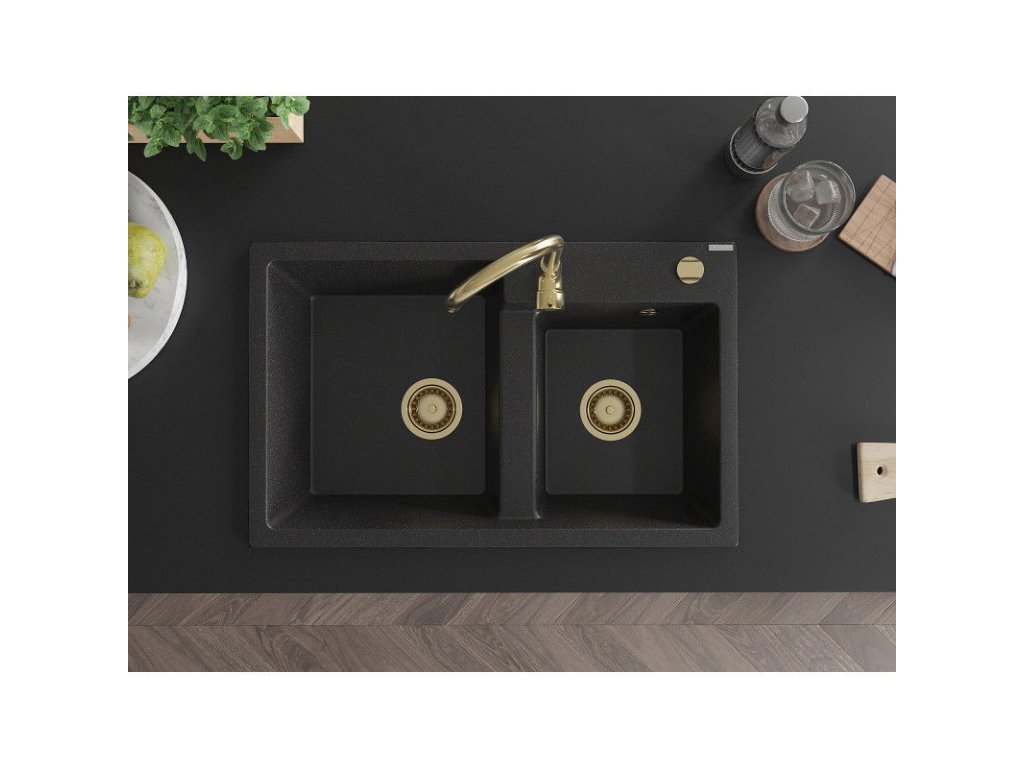 Mexen Tomas 2-komorový granitový drez s kuchynskou batériou Telma, čierna/strieborná metalíza - 6516-73-670200-50