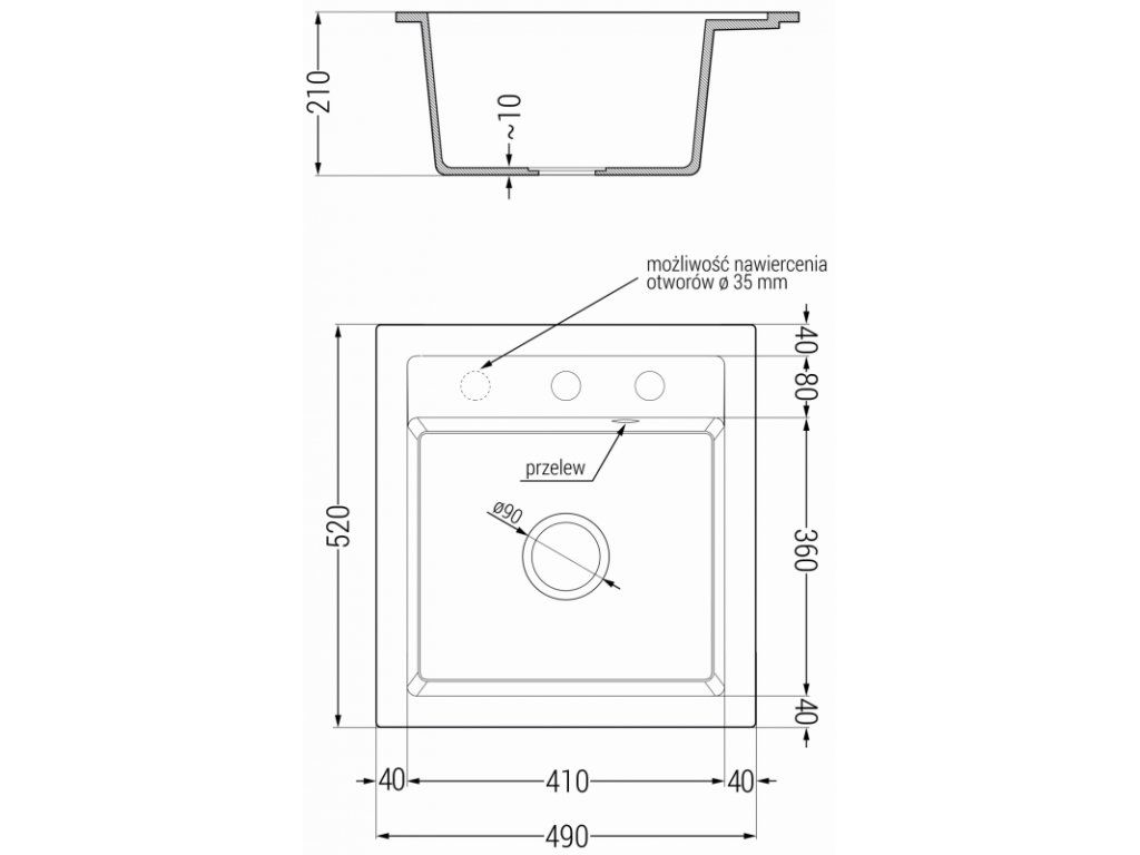 Technické údaje: rozmery: 520x490x210 mm hĺbka komory: 200 mm rozmery komory: 410x360 mm priemer odtoku: ø90 mm model: 1-komorový typ: zapustené do pracovnej dosky farba: čierny materiál: žula prepadový otvor: áno otvor pre batériu: áno automatický sifón v sade vysoká odolnosť proti poškriabaniu a zafarbeniu odolnosť proti tepelným šokom povrch pre ľahké čistenie jeden dodatočný vyfrézovaný otvor pre samodierovanie ø35Dodatočné parametre