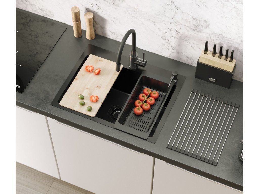 | Kompletný s umývadlom: | tesnenie, sifón so sitkom, upevňovacie háčiky, Kuchynská batéria, dávkovač pracieho prostriedku, steel-silicon mat, bamboo board |