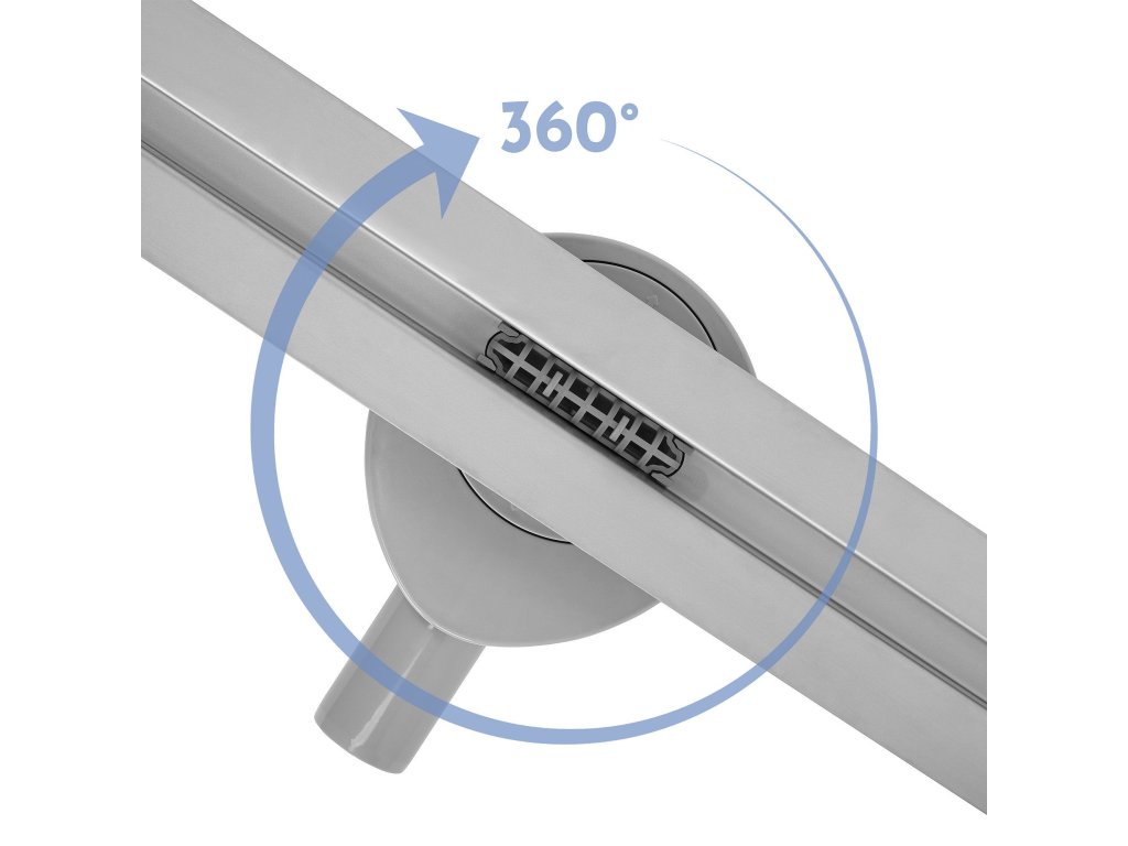 Odtokový žľab je celý vyrobený z kyselinovzdornej nerezovej ocele Aisi 304. Je vybavený radom inovatívnych technológií, ktoré uľahčujú montáž a každodenné používanie. V odtoku je použitý dvojitý filtračný systém, ktorý dokonale zabraňuje vnikaniu nečistôt a predmetov, ktoré môžu blokovať odtok vody do kanalizácie. Výhodou tohto systému je ľahké čistenie. Sada obsahuje: nohy, sifón, Dry-Fix manžetu, košík, užívateľskú príručku a háčik na výmenu krytu žľabu.Dodatočné parametre