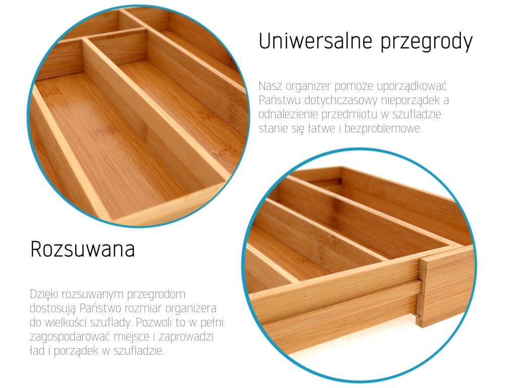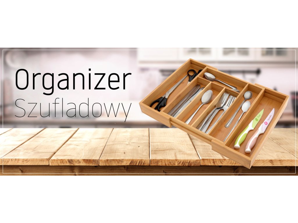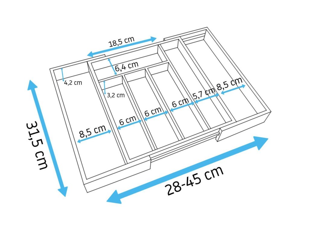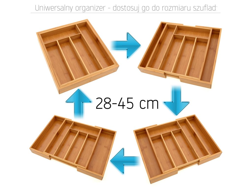 Predstavujeme vám výrobok, ktorý vyrieši problém s neporiadkom v zásuvkách. Náš organizér vám pomôže udržať v čistote zásuvky v kuchyni, kancelárii, pracovni, detskej izbe, dielni, obývačke. V zloženom stave má organizér šírku 28 cm a 5 priehradiek rôznych veľkostí, pričom jeho najväčšou výhodou je, že sa dá rozšíriť až na 45 cm a získať tak 2 veľké priehradky. Vďaka nastaviteľnej šírke môžete náš organizér prispôsobiť akejkoľvek veľkosti zásuvky.Dodatočné parametre