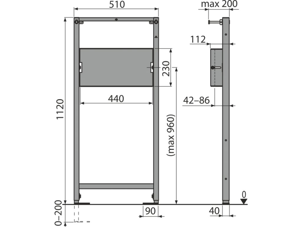 Záťažová skúška 150 kg\n\nPre montáž podomietkovej armatúry\nPre montáž pred nosnú stenu alebo do sadrokartónovej konštrukcie\n\nSamonosný rám\nVýškovo nastaviteľné priečky\nNastaviteľné kotviace výsuvné nohy s brzdou v rozmedzí 0–200 mm\nKonštrukcia rámu dovoľuje ukotvenie k samostatnej, dostatočne nosnej sadrokartónovej priečke alebo pred nosnú stenu\nMateriál: kov ošetrený práškovou farbou\n\nRozsah dodávky:\n\nRám\nFixačný materiál: vrut Ø8×60 mm – 4 ks, hmoždinka Ø12 mm – 4 ks\nDoska na uchytenie podomietkovej batérie\n
