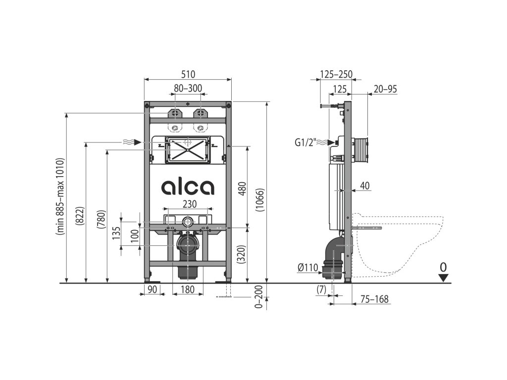 TECHNICKÉ PARAMETRE:\nŠírka: 510 mm\nHĺbka: 160-200 mm\nStavebná hĺbka: 125 mm (s odpadovým kolenom 160 mm)\nMontážna hĺbka: 20 - 95 mm\nVýška: 1067 mm\nPripojenie: G 1/2"\nObjem vody v nádržke: 9 l\nVeľké spláchnutie: 6 - 9 l\nMalé spláchnutie: 2,5 - 3,5 l\nVýsuvné nohy: 0 - 200 mm\nRozsah tlaku vody: 0,3 - 0,6 MPa\nHmotnosť: 15,9 kg\n\nMateriál: kov ošetrený práškovou farbou\n\n- pre montáž nástennej armatúry\n- pre závesnú výlevku s rozstupom kotviacich skrutiek až do 420 mm a odpadom O90/110\n- pre montáž pred nosnú stenu alebo do sadrokartónovej konštrukcie\n- pre vyvedenie nástennej armatúry\n- výškovo nastaviteľné priečky\n- rohový ventil s možnosťou na napojenie na potrubný systém Mepla\n- konštrukcia rámu dovoľuje kotvenie k samostatnej, dostatočne nosnej sadrokartónovej priečke alebo pred nosnú stenu\n- konštrukcia polysterenovej nádržky zabraňuje roseniu na povrchu nádržky a tlmí prestup vibrácií\n- duálne splachovanie, nezávisle nastaviteľné s hygienickou rezervou\n- servisné práce bez použitia náradia\n- prívod vody zozadu / zhora uprostred\n- záťažová skúška 400 kg\n\nRozsah dodávky:\nNádrž s napúšťacou a vypúšťacou armatúru\nSamonosný rám\nNákrutka 1/2" pre pripojenie vody s integrovaným rohovým ventilom Schell 1/2" - 3/8"\nSkrutka mechanizmu 2 ks\nFixačný set: vrut O8x60 - 4 ks, hmoždinka O12 - 4 ks\nPripojovacie šróbenie G 3/4"-G1/2"\nFixačný materiál pre uchytenie WC misy: závitová tyč M12 - 2 ks, podložky - 4 ks, krytka - 2 ks, matica - 2 ks, Chránička závitu - 2 ks\nKoleno odpadu HT90/110 s tesnením\nKotviaci materiál: vrut O8x60 - 4 ks, hmoždinka O12 - 4 ks\nTesnenie prívodu, vývodka polypropylén, vrapová vložka\nTesnenie odpadu, prepojka polypropylén, tesnenia prepojky\nKryt servisného otvoru dvojdielny, jednoducho zkrátitelný
